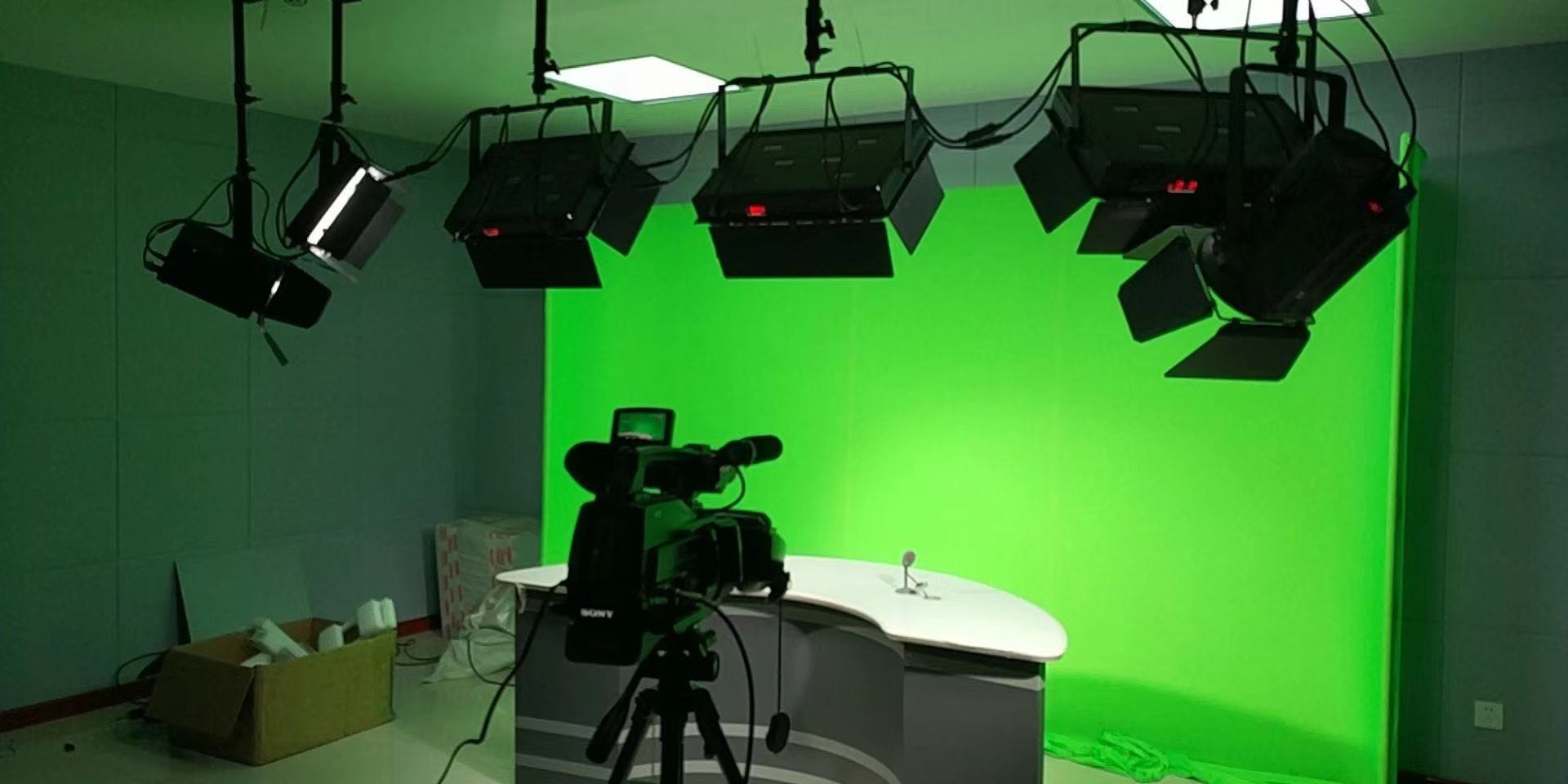 2.灯光 灯具选择光线均匀柔和、无频闪、冷光源(光效高低热量)、色温恒定、高显指还原度真实,满足高清拍摄。虚拟蓝箱演播室常用的灯具:LED影视平板柔光灯。 虚拟演播室蓝箱布光要均匀的照亮整个虚拟蓝箱,先人物前景布光,后蓝箱布光。前景照度满足要求后,再对蓝箱进行补光就可以满足视频抠蓝的要求,注意不能出现明显的光斑或人物背影。
